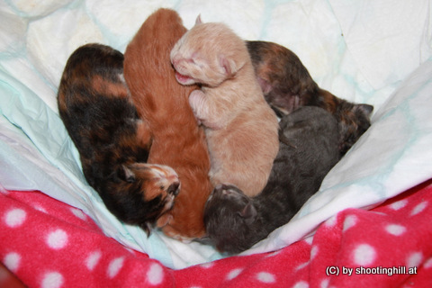 Unsere Traum-Mama Holly go Lightly the PURRFECT COON hat ihre 7 Babies am 2.2 ganz pünktlich und problemlos bekommen. In einer Rekordzeit von 2 Stunden 20 min. waren wir beide beschäftigt mit 7 x Geburt, abwiegen und staunen. Papa ist wieder J'arred Nova Axis Star. Es ist ein kunterbunter Wurf, 2 creme-Buben, 1 rot-weißer Bub, 1 blautabby-ticked Bub, ein dreifärbiges Mädel blacktabbywhite, 1 schwarzes Mädel und 1 tortie wie Mama. Das blaue Kitten und die Tortie waren die Kleinsten. Das Tortie-Mädel ist mein kleines Flaschenkind, bei 7 Babies war zufüttern doch wichtig.